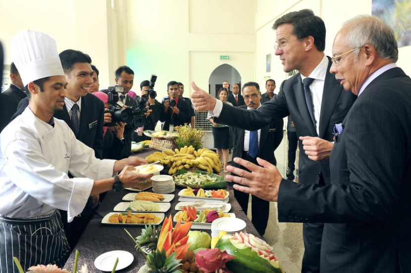 Perdana Menteri Belanda, Mark Rutte (dua, kanan) menunjukkan isyarat bagus selepas merasai buah-buahan tempatan yang diperkenalkan Najib ketika majlis makan tengah hari di kediaman rasminya di Seri Perdana di sini sempena kunjungan rasmi Perdana Menteri Belanda itu selama sehari ke Malaysia, Rabu.