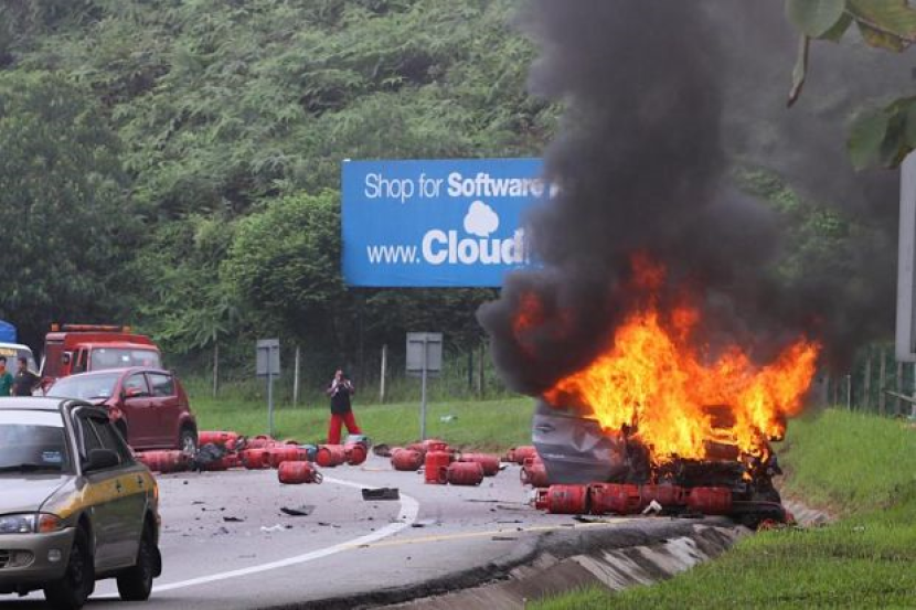 "Treler tersebut menuju ke utara sebelum terbabas dan beberapa tong gas tercampak di atas jalan.