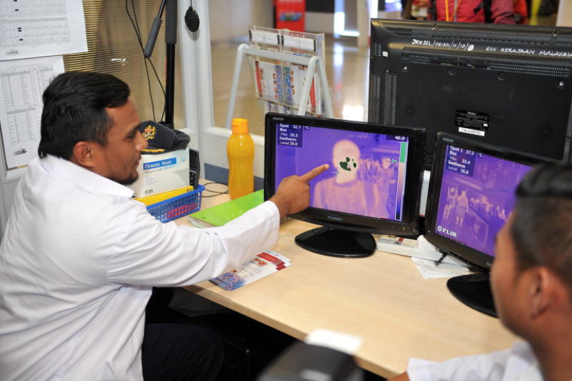 Petugas Perubatan Kementerian Kesihatan Malaysia (KKM) Mohd Haizil Sa'ani (kiri) menunjukkan imej yang diimbas melalui kamera thermal bagi mengesan suhu badan penumpang pesawat di Pusat Pemantauan Saringan Ebola yang berfungsi 24 jam di Terminal Ketibaan Lapangan Terbang Antarabangsa Kuala Lumpur (KLIA). Pintu masuk antarabangsa Johor turut menyediakan imbasan kesihatan tersebut.