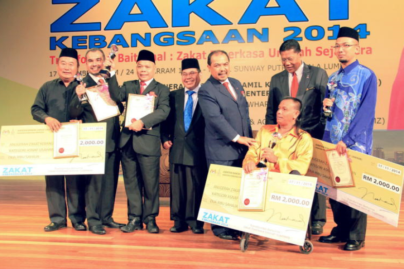 Jamil Khir (dua, kanan) bersama penerima Anugerah Zakat Kebangsaaan 2014 ketika majlis pelancaran sambutan Bulan Zakat Kebangsaan 2014 yang bertemakan 'Transformasi Baitulmal Zakat Diperkasa Ummah Sejahtera' di sini, Isnin. Turut sama Ketua Pengarah Jabatan Wakaf, Zakat dan Haji (Jawhar) Datuk Anan C Mohd (empat, kiri).