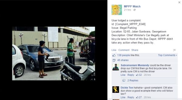 Laporan mengenai kesalahan meletakkan kenderaan di lokasi larangan itu dibuat di laman Facebook Majlis Perbandaran Pulau Pinang (MPPP) Watch.