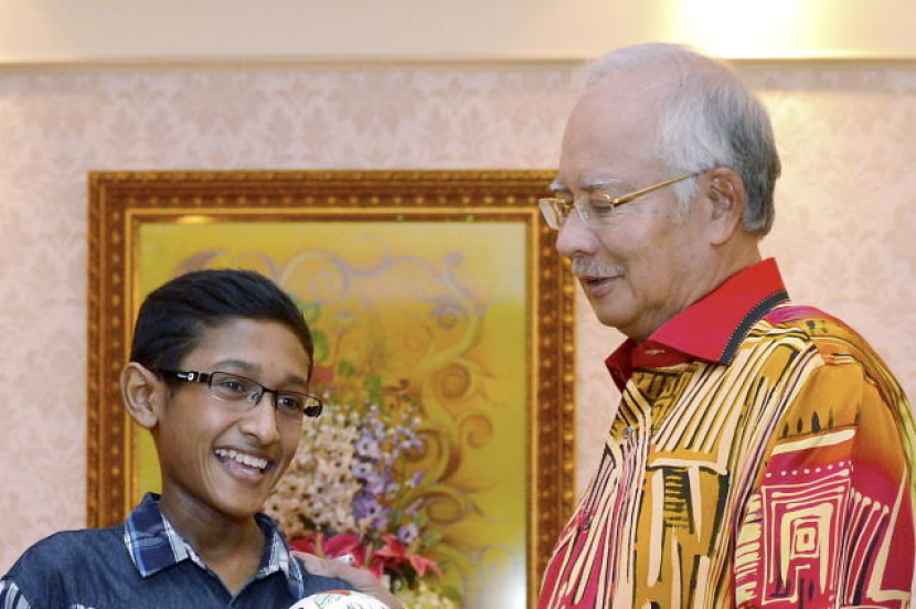 Adam yang mencatatkan keputusan cemerlang 5A dalam Ujian Pencapaian Sekolah Rendah (UPSR) baru-baru ini turut menyampaikan bola rasmi Piala AFF Suzuki kepada Perdana Menteri sebagai cenderahati.