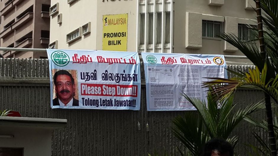 Malah kain rentang yang tertera perkataan 'Tolong Letak Jawatan' dengan wajah Palanivel digantung di atas jejambat Lebuhraya Tun Razak menghadap bangunan tersebut.