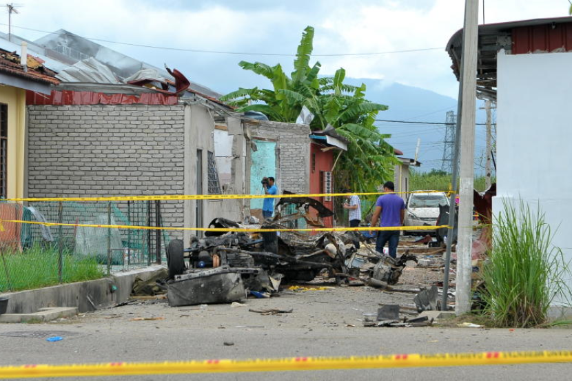 Anggota polis masih kelihatan menjalankan siasatan di tempat kejadian letupan bom yang mengorbankan tiga orang di Taman Ria Mesra pada Khamis. Foto: BERNAMA