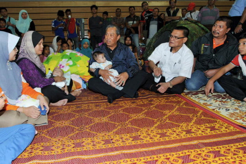 Muhyiddin Yassin beramah mesra bersama mangsa-mangsa banjir semasa melawat Pusat Pemindahan Stadium Sukpa di sini Jumaat.
