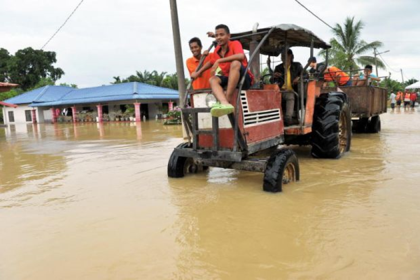 Barangan keperluan mangsa banjir terpaksa dipindahkan menggunakan traktor ke pusat pemindahan di Kampung Pasir Garam dan Kampung Pulau Tiga Kiri.- fotoBERNAMA