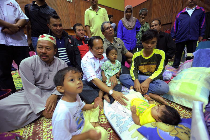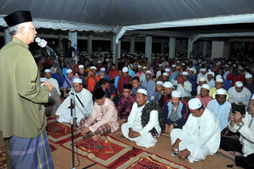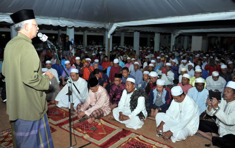 Perdana Menteri, Datuk Seri Najib Tun Razak (kiri) berucap sebelum menunaikan solat Isyak ketika hadir pada Majlis Mensyukuri Kehadiran Tahun Baru 2015 di Sekolah Kebangsaan Pengkalan Kubor 2 di Tumpat, malam Tabu. Turut hadir Menteri Perdagangan Antarabangsa dan Industri Datuk Seri Mustapa Mohamed (tiga, kanan). -fotoBERNAMA