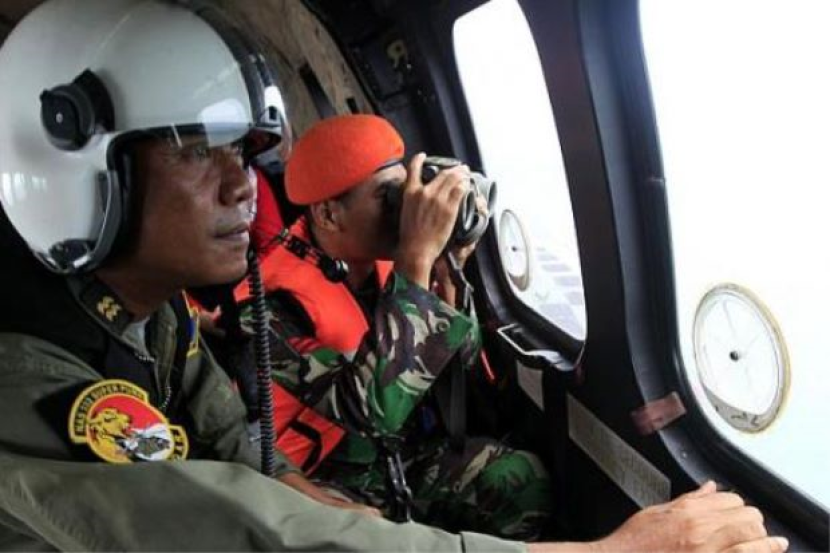 Anak kapal Indonesia mengamati bahagian permukaan laut, dalam operasi carian pesawat AirAsia, penerbangan QZ8501 dari dalam pesawat di Laut Jawa. -foto AFP.