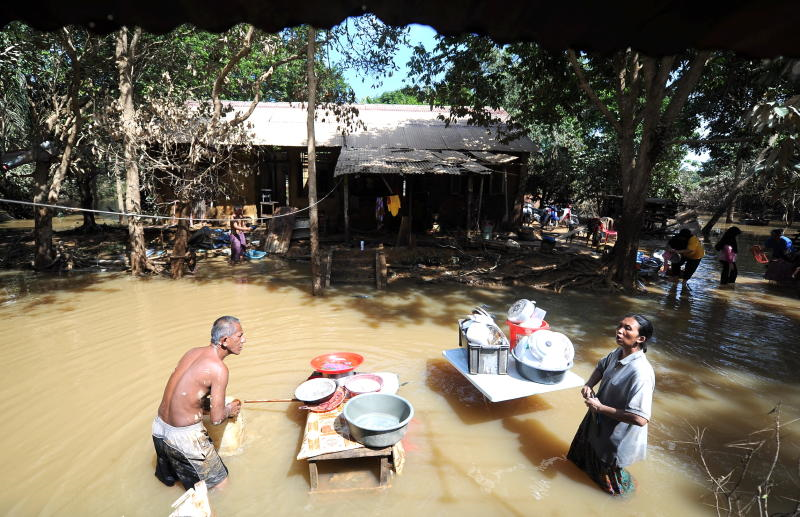 Penduduk Kampung Awah, Maran, Abu Talib Mohamad, 52, dan isterinya, Saimah Omar, 46 giat membasuh perkakas dapur yang disaluti lumpur di hadapan rumah yang masih digenangi air.