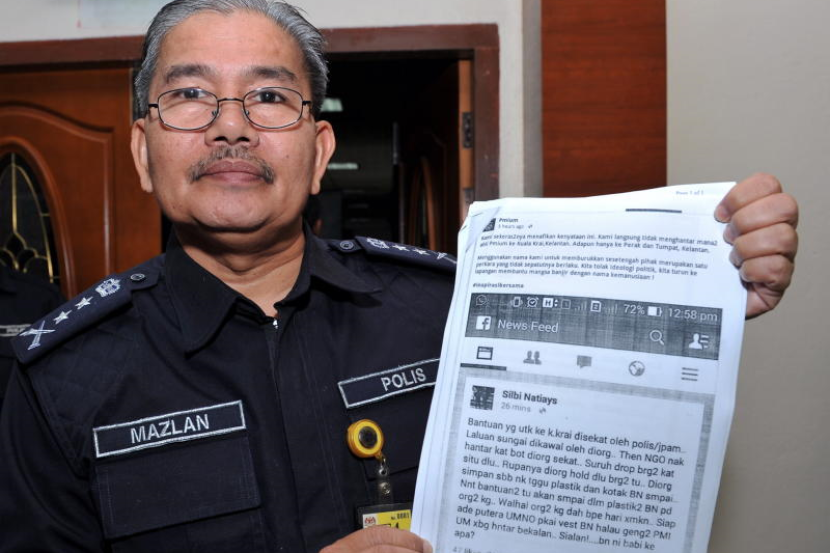 "Suspek dipercayai menyebarkan maklumat palsu melalui laman sosial Facebook kononnya bekalan makanan yang dibawa sebuah badan bukan kerajaan untuk dihantar ke Kuala Krai telah disekat oleh pihak berkuasa.
