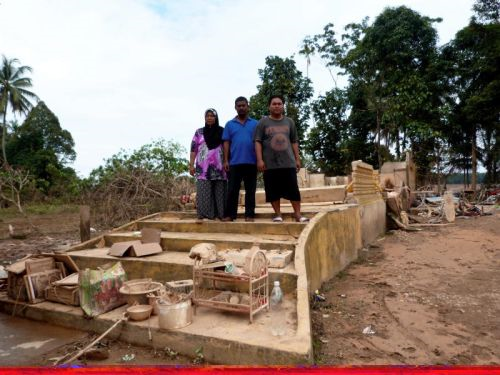 Mangsa banir, Jamilah Ridzuan bersama anak-anaknya di tapak rumah mereka yang dihanyutkan air di Kampung Teluk Choh, Temangan Lama, Machang, Kelantan.