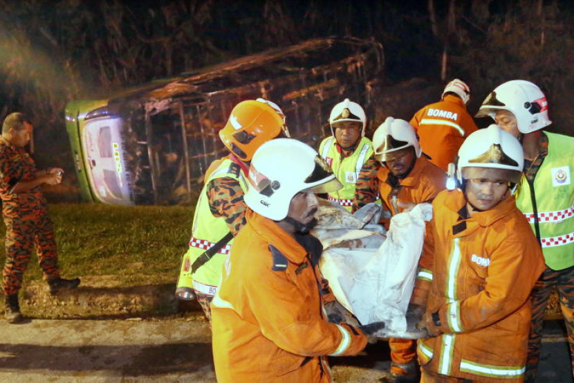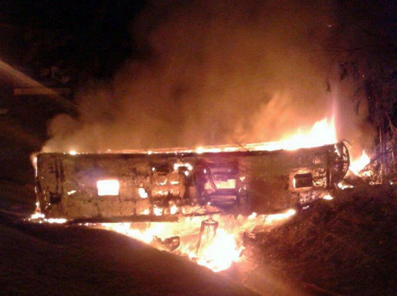 Bas berkenaan yang membawa 30 penumpang dari Kuala Kurau, Parit Buntar menuju Genting Highlands dilapor cuba mengelak sebuah tayar lori di tengah jalan sehingga menyebabkannya terbabas ke dalam parit dan terbakar.