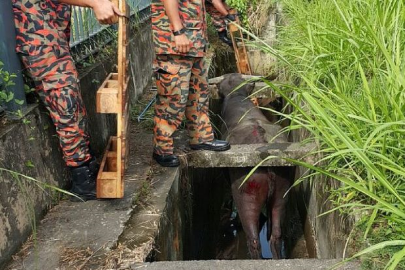 Menggunakan bongkah kayu, anggota bomba membentuk tanjakan sementara dan berjaya membuatkan haiwan itu naik ke atas semula dalam operasi selama 30 minit.