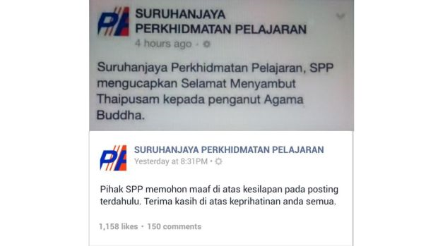 PETALING JAYA: Kesilapan Suruhanjaya Perkhidmatan Pelajaran (SPP) membuat ucapan Thaipusam di laman rasmi Facebooknya baru-baru ini perlu dijadikan pengajaran kepada semua dalam mengeluarkan kenyataan khususnya mengenai bangsa dan agama, kata P. Kamalanathan. Kesilapan tersebut berlaku apabila suruhanjaya itu baru-baru ini tersilap membuat ucapan Thaipusam yang sepatutnya disambut oleh penganut agama Hindu telah ditujukan kepada penganut Buddha: “Suruhanjaya Perkhidmatan Pelajaran, SPP mengucapkan Selamat Menyambut Thaipusam kepada penganut agama Buddha.” Bagaimanapun SPP pada Sabtu lalu telah mengeluarkan kenyataan permohonan maaf di atas kesilapan berkenaan. (Gambar atas) Suruhanjaya Perkhidmatan Pelajaran membuat kesilapan dalam ucapan Thaipusam, manakala (gambar bawah) merupakan permohonan maaf yang dibuat di atas kesilapan yang berlaku. Kamalanathan yang merupakan Timbalan Menteri Pendidikan II dan juga anggota Jawatankuasa Kerja Pusat (CWC) MIC berkata, isu tersebut dianggap selesai selepas suruhanjaya itu membuat permohonan maaf kepada umum. "Namun kejadian sebegini boleh menjadi pengajaran supaya lebih berhati-hati apabila membuat komen khususnya tentang agama dan bangsa. “Selain itu, rakyat Malaysia umumnya boleh mengambil pengajaran dan ikhtibar untuk lebih saling-mengenali dan memahami pelbagai perayaan yang disambut oleh masyarakat majmuk di negara kita,” katanya kepada mStar Online menerusi khidmat pesanan ringkas (SMS) pada malam Isnin. SPP dalam permohonan maafnya di Facebook berkata: “Pihak SPP memohon maaf di atas kesilapan pada posting terdahulu. Terima kasih di atas keprihatinan anda semua." Ucapan Thaipusam di Facebook SPP digantikan dengan “Suruhanjaya Perkhidmatan Pelajaran mengucapkan Selamat Menyambut Hari Thaipusam.”