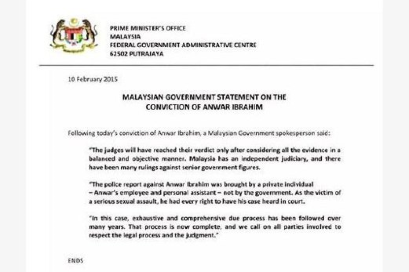 KUALA LUMPUR: Kerajaan Malaysia mengeluarkan kenyataan berikutan keputusan Mahkamah Persekutuan pada Selasa yang menolak rayuan Ketua Pembangkang, Datuk Seri Anwar Ibrahim terhadap kesalahan meliwat bekas pembantunya, Mohd Saiful Bukhari Azlan.