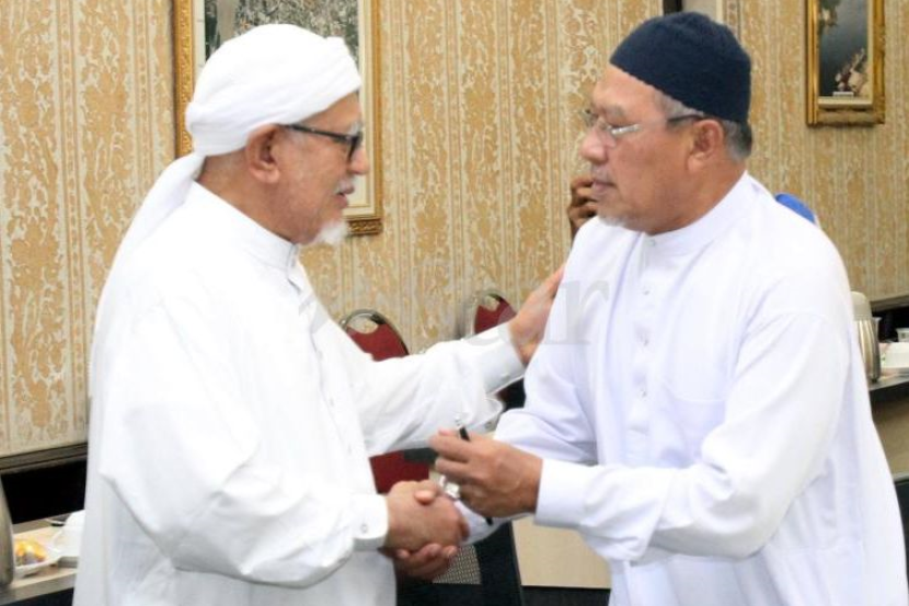 Presiden PAS, Datuk Seri Abdul Hadi Awang bersalaman dengan Menteri Besar Kelantan, Datuk Ahmad Yaakub ketika mesyuarat Jawatankuasa PAS Pusat di kediaman rasmi Menteri Besar di JKR 10, Kota Baru pada Jumaat.