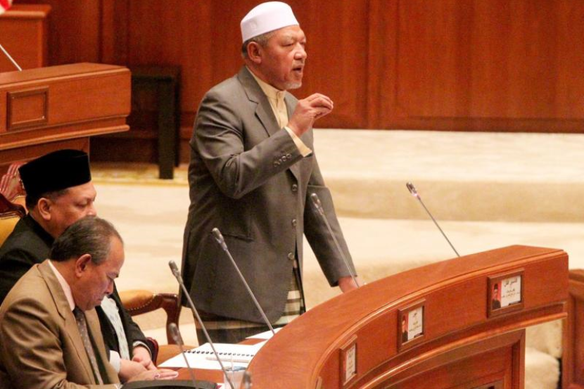 Menteri Besar Kelantan, Datuk Ahmad Yakob ketika menggulung perbahasan Rang Undang-Undang Kanun Jenayah Syariah Hudud, Qisas dan Takzir dalam Sidang Dewan Undangan Negeri (DUN) Kelantan di Kota Darul Naim.
