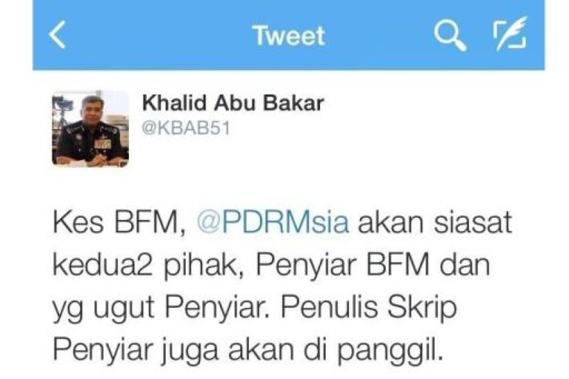 "Kes BFM, @PDRMsia akan siasat kedua-dua pihak. Penyiar BFM dan yang ugut penyiar. Penulis skrip penyiar juga akan dipanggil," katanya dalam 'tweet'nya.