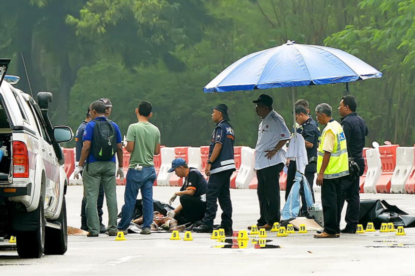 Anggota forensik polis sedang memeriksa mayat seorang daripada dua penjenayah yang ditembak mati selepas berbalas tembakan dengan polis di Jalan Rasah- Port Dickson pada Sabtu.