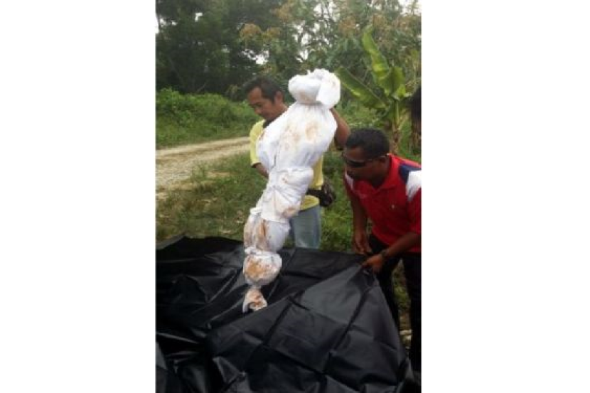 Penduduk kampung memasukkan objek berukuran kira-kira 1.5 meter yang dibentuk menyerupai mayat berkafan ditemui di persimopangan Jalan Nangka-Jalan Belinjau menuju Kampung Kelantan di Kota Tinggi, Ahad. - Foto BERNAMA
