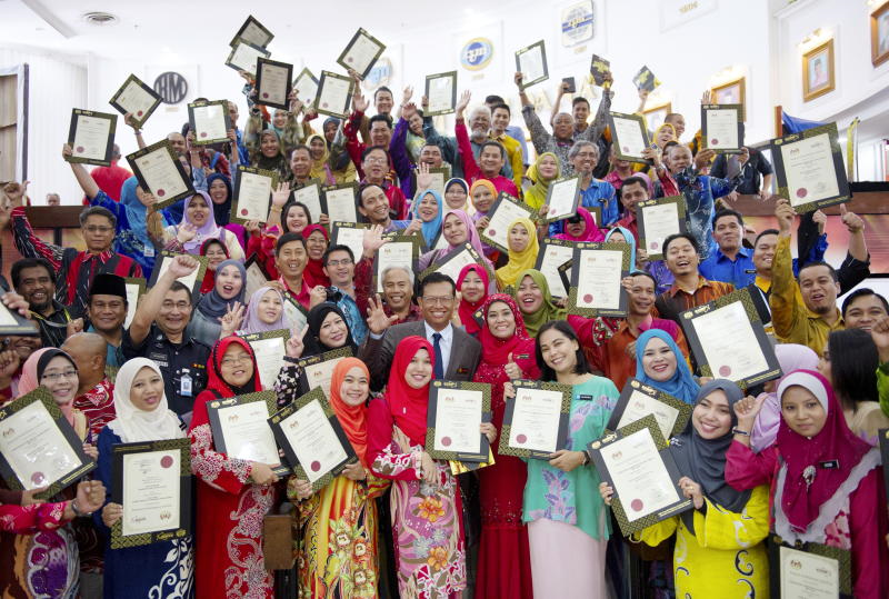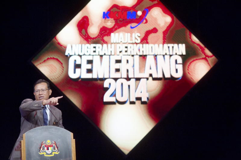 Ahmad Shabery (tengah) dan Ketua Setiausaha Kementerian Komunikasi dan Multimedia Malaysia (KKMM) Datuk Seri Dr Sharifah Zarah Syed Ahmad(depan,lima kanan) bergambar bersama sebahagian daripada 686 warga KKMM yang menerima Anugerah Perkhidmatan Cemerlang KKMM 2014 di Auditorium Perdana Angkasapuri , Khamis.