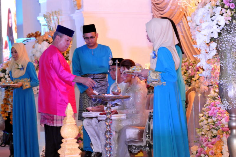Sultan Johor berkenan menepung tawar anak Datuk Seri Mohamed Khaled Nordin, Akmal Saufi bersama pasangannya Noor Shamiza Sayuti di kediaman rasmi Menteri Besar di Saujana di Johor Bahru, malam Jumaat. Foto ABDUL RAHMAN EMBONG / THE STAR