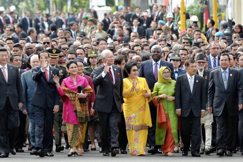 Najib bersama isteri Datin Seri Rosmah Mansor berada di barisan hadapan bersama Presiden Indonesia Joko Widodo dan beberapa ketua negara, anggota-anggota Parlimen serta para perwakilan AACC berjalan kira-kira 50 meter dari hotel Savoy Homann Bidakara menuju ke Gedung Merdeka Bandung.