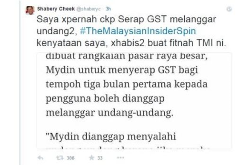 Pada Sabtu, portal tersebut menerbitkan berita dengan memetik Ahmad Shabery sebagai berkata keputusan yang dibuat rangkaian pasar raya besar Mydin untuk menyerap GST bagi tempoh tiga bulan pertama kepada pengguna boleh dianggap melanggar undang-undang.