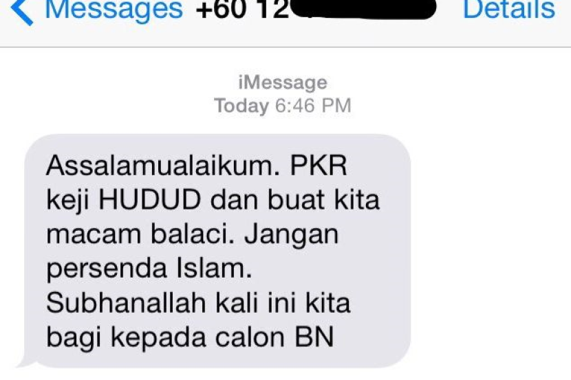"Assalamualaikum. PKR keji HUDUD dan buat kita macam balaci. Jangan persenda Islam. Subhanallah kali ini kita bagi kepada calon BN,” demikian menurut kandungan SMS berkenaan.