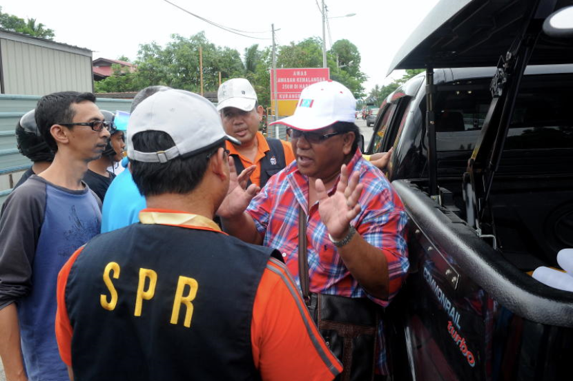 Penyokong calon PKR bertengkar dengan pegawai SPR yang bertugas menanggalkan poster kempen di kawasan larangan pada Khamis.