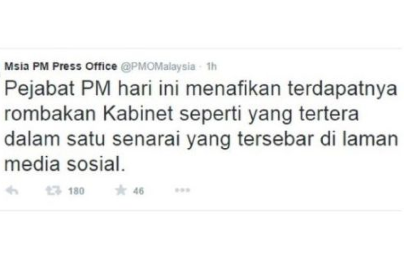 "Pejabat PM hari ini menafikan terdapatnya rombakan Kabinet seperti yang tertera dalam satu senarai yang tersebar di laman media sosial.