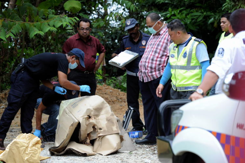 Anggota Polis Forensik mengumpul bahan bukti pada sebuah kotak besar yang dijumpai bersama mayat wanita yang reput di sebuah hutan di Puncak Bukit Mutiara, Tanjung Bungah pada Sabtu. Foto: BERNAMA.