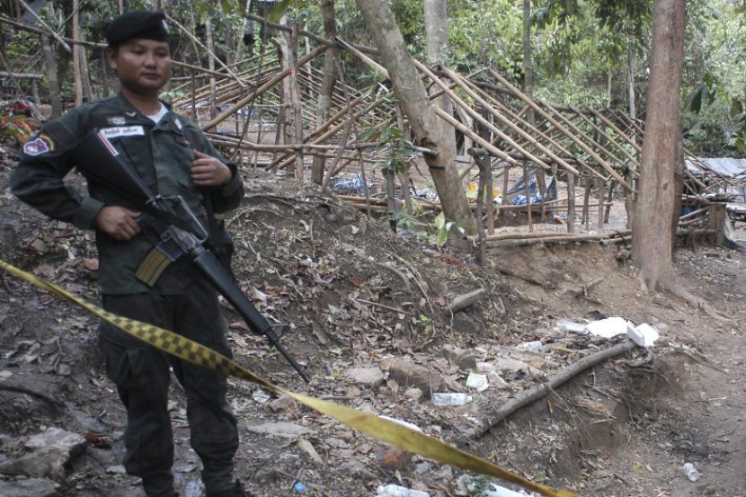 Seorang pegawai polis peronda sempadan Thailand mengawal kawasan di sebelah tempat tinggal sementara disyaki kepunyaan etnik pelarian Rohingya selepas kubur beramai-ramai ditemui di sebuah hutan di daerah Sadao, wilayah Songkhla, selatan Thailand pada 2 Mei lalu. Pihak berkuasa menemui kubur beramai-ramai yang mengandungi sekurang-kurangnya 30 mayat di sebuah kem penyeludupan manusia di selatan Thailand.