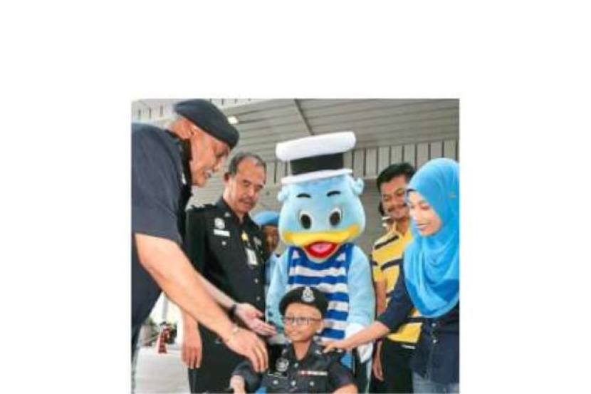 Farish Danish Akasha Faudzi, 9, dan disahkan menderita penyakit kanser sejak dua tahun lepas, dapat menzahirkan kegembiraan apabila beliau diberi peluang mengenakan uniform polis biru gelap serta tag nama dengan pangkat Inspektor.