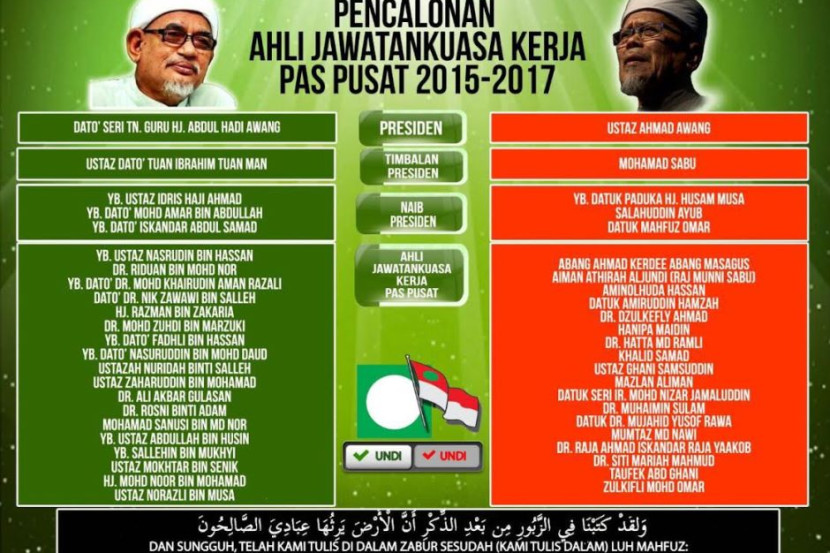 GOMBAK: Dewan Ulama PAS mengakui mengeluarkan senarai pilihan atau 'Cai' bagi jawatankuasa tertinggi di peringkat Pusat yang menyaksikan sayap kanan parti itu menolak Ahmad Awang sebagai calon Presiden. Menerusi senarai itu, dewan berkenaan juga secara terbuka mahu Datuk Tuan Ibrahim Tuan Man menggantikan kedudukan Mohamad Sabu bagi jawatan Timbalan Presiden PAS. Ketua Penerangan Dewan Pemuda PAS Pusat, Datuk Dr Khairuddin Aman Razali bagaimanapun menafikan senarai berkenaan sebagai cubaan Dewan itu untuk mempengaruhi perwakilan PAS. “Bagi kita, mereka boleh meneruskan perjuangan PAS, mereka memang sesuai untuk dibawa ke depan menjadi pemimpin parti. “Maka itu adalah sebahagian penjelasan kita kepada ahli. Tak timbul isu mempengaruhi tapi itu cara kita kemukakan mereka yang dirasakan mampu untuk ikut dasar parti. “Kita tak nafikan orang lain juga berkemampuan, tapi kita ketengahkan yang mampu bawa aspirasi Islam,” katanya pada sidang media selepas majlis perasmian Muktamar Tahunan Dewan Ulama PAS Pusat ke-54 di Dewan Datuk Fadzil Mohd Noor, Kolej Universiti Islam Zulkifli Muhammad (KUIZM) di sini, Rabu. Sejak awal hari ini, Dewan Ulama PAS Pusat menerusi akaun rasmi Facebook mereka memuat naik senarai cadangan calon pilihan bagi semua jawatan yang dipertandingkan dalam pemilihan kepimpinan baharu PAS yang akan berlangsung esok di Kuala Selangor. Turut disebarkan di media sosial ialah info grafik senarai pilihan bagi dua kumpulan yang diketuai Presiden PAS, Datuk Seri Abdul Hadi Awang dan pencabarnya, Ahmad. Selain itu, kepimpinan Ulama turut mencadangkan supaya perwakilan memilih Datuk Mohd Amar Nik Abdullah, Datuk Iskandar Samad dan Idris Ahmad bagi jawatan Naib Presiden PAS. Antara pemimpin yang sering dikaitkan dengan kumpulan pro Pakatan Rakyat disenaraikan dalam kumpulan Ahmad ialah, Datuk Dr Mujahid Yusoff Rawa, Dr Dzulkefly Ahmad, Dr Mohd Hatta Ramli, Mohamed Hanipa Maidin, Khalid Samad dan Dr Siti Mariah Mahmud.