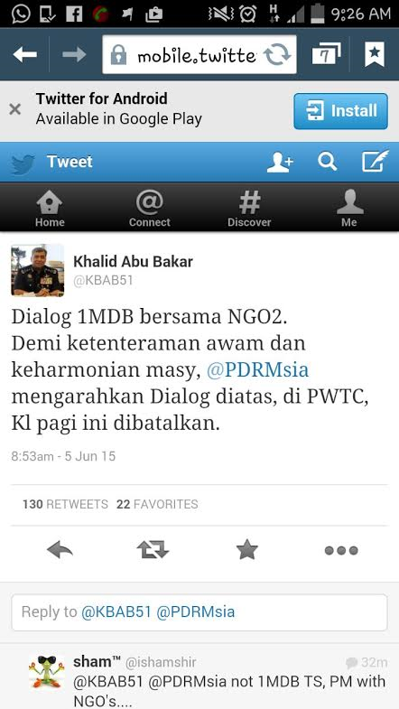 "Dialog 1MDB bersama NGO2. Demi ketenteraman awam dan keharmonian masy, @PDRMsiamengarahkan Dialog diatas, di PWTC, Kl pagi ini dibatalkan," katanya menerusi Twitter.