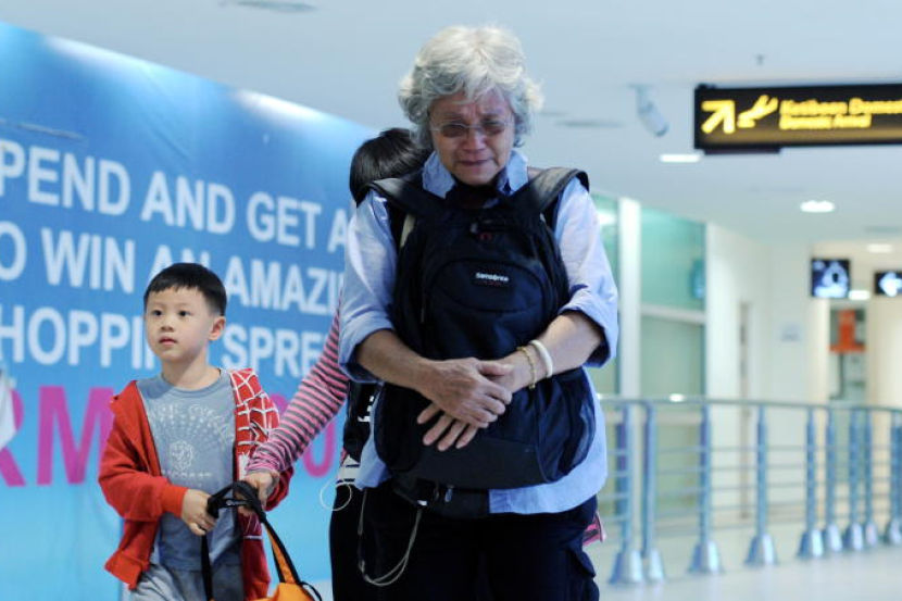 Anggota keluarga yang dipercayai ibu mendiang Lim Choon Seong,45, memeluk beg yang mengandungi abu anaknya sebaik tiba di Lapangan Terbang Antarabangsa Pulau Pinang pada Selasa.