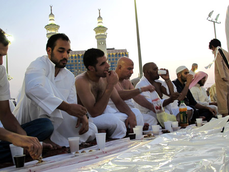 Pada jam 5.30 petang, kami bersiap-siap ke Masjidil Haram untuk berbuka puasa. Saya membuat keputusan untuk berbuka puasa di dalam masjid kerana mahu merasa dan menikmati suasana berbuka di Tanah Suci walaupun sebelum itu ada yang menasihatkan saya supaya berbuka di hotel terlebih dahulu.