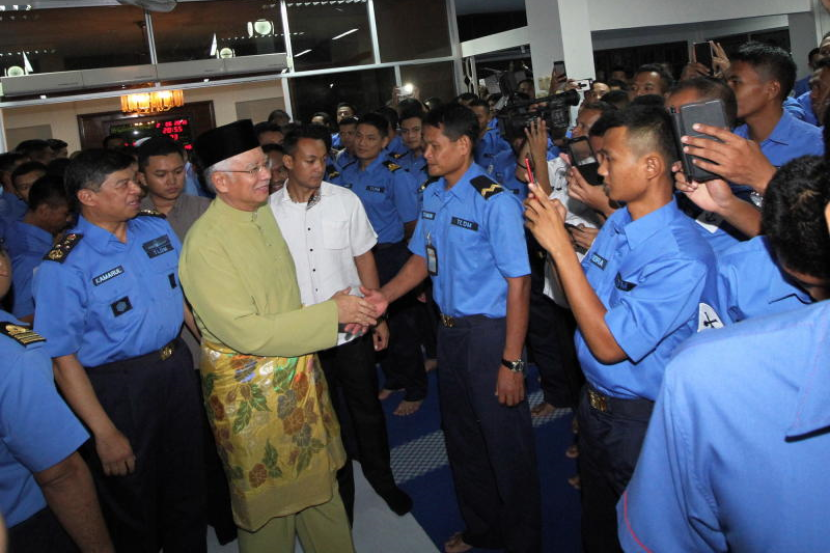 Datuk Seri Najib Tun Razak bersalaman dengan warga Tentera Laut Diraja Malaysia (TLDM) selepas menunaikan solat sunat Tarawih di Masjid An-Nur, Pangkalan TLDM Lumut pada Ahad malam. -fotoBERNAMA