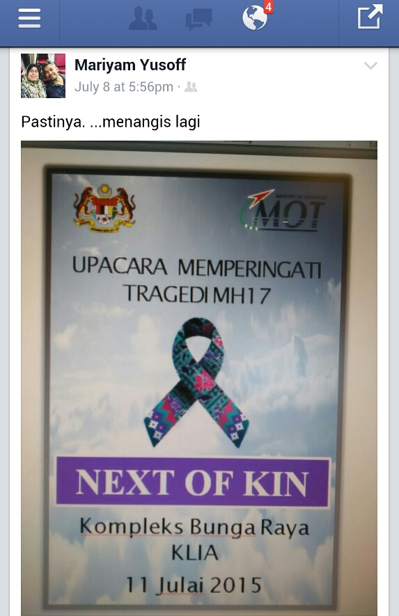 "Anda tidak berada di tempat kami dan orang yang anda sayang tidak berada dalam pesawat itu. Tak apalah, kami reda. Alhamdulillah, kami masih diberikan kekuatan terutama dengan sokongan daripada keluarga," katanya kepada mStar Online.
