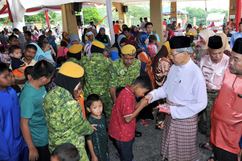 Mustapa Mohamed (tiga, kanan) menyampaikan duit raya kepada kanak-kanak yang hadir pada Majlis Rumah Terbuka Aidilfitri di Darul Falah, Ahad. Foto: Bernama