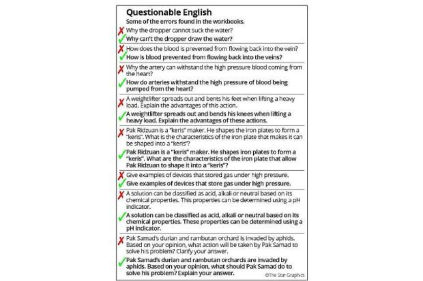 Beliau berkata Kementerian Pendidikan sepatutnya menjaga kualiti tatabahasa buku latihan berkenaan supaya kredibiliti pembuat soalan daripada Lembaga Pepepriksaan Malaysia tidak dipertikaikan orang ramai.