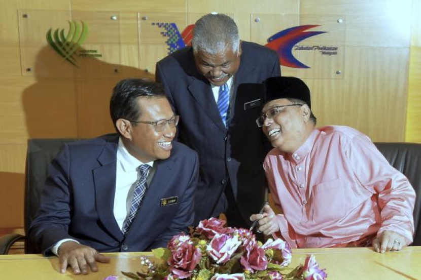 Ismail Sabri (kanan) bermesra dengan penggantinya Ahmad Shabery (kiri) dan Ketua Setiausaha kementerian itu Datuk Mohd Arif Ab Rahman (tengah) pada majlis penyerahan nota serah tugas Menteri Pertanian dan Industri Asas Tani pada Isnin. Ismail Sabri kini memegang jawatan Menteri Kemajuan Luar Bandar dan Wilayah. -fotoBERNAMA