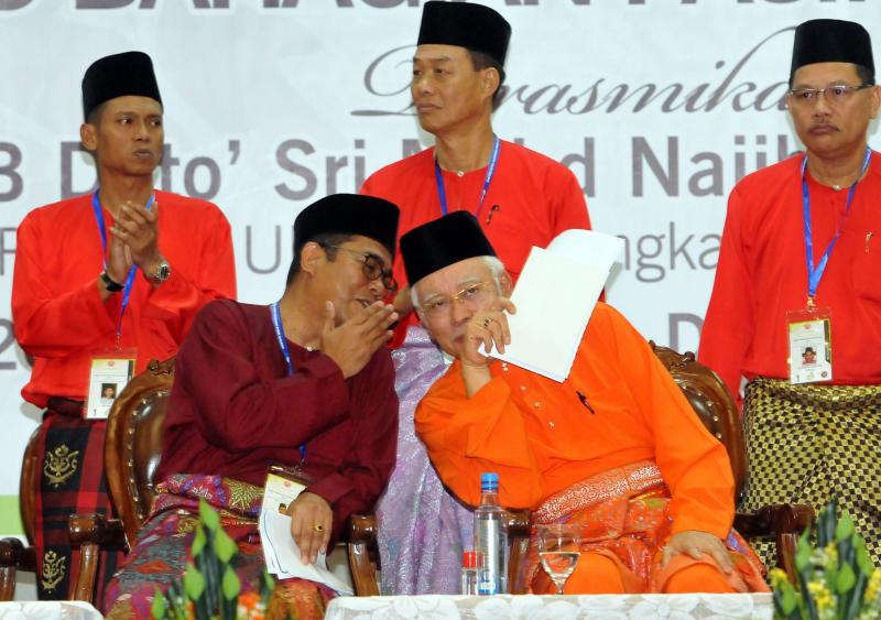 Menteri Besar, Datuk Seri Khaled Nordin memperkatakan sesuatu kepada Najib pada mesyuarat Umno Bahagian Pasir Gudang, Ahad.
