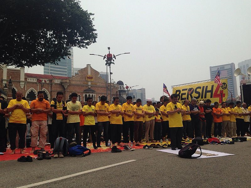 1.35 petang: Peserta Bersih 4 menunaikan solat Zohor berhampiran Dataran Merdeka.