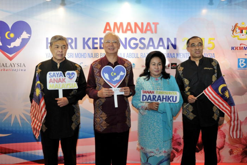 Najib Tun Razak diapit sebelah kanan Dr Ahmad Zahid Hamidi, isteri Najib, Rosmah Mansor dan Menteri Komukasi dan Multimedia Datuk Seri Dr Salleh Said Keruak (kanan) membawa cogankata dan Jalur Gemilang hadir pada majlis Amanat Hari Kebangsaan 2015 oleh Perdana Menteri di Pusat Konvensyen Kuala Lumpur, Ahad malam. Foto: Bernama.