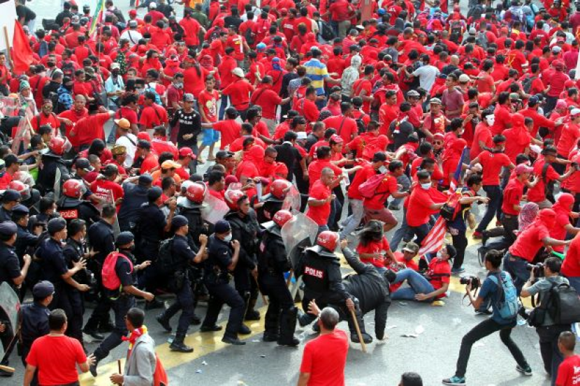 Pada petang Rabu, sekumpulan peserta baju merah di Petaling Street enggan bersurai selepas Pasukan Simpanan Persekutuan (FRU) melepaskan tembakan air ke arah mereka.