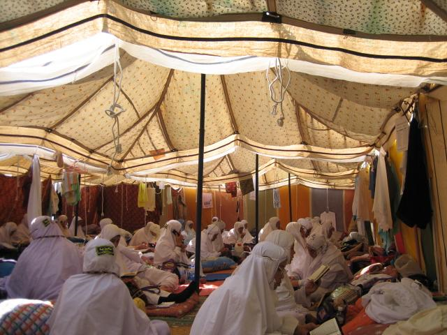 Jemaah haji menghabiskan masa beribadat di dalam khemah. Kami tidak banyak bersembang. Berbual hanya yang perlu sahaja. Selainnya masing-masing beribadat sama ada membaca al-Quran, berzikir dan bersolat sunat.