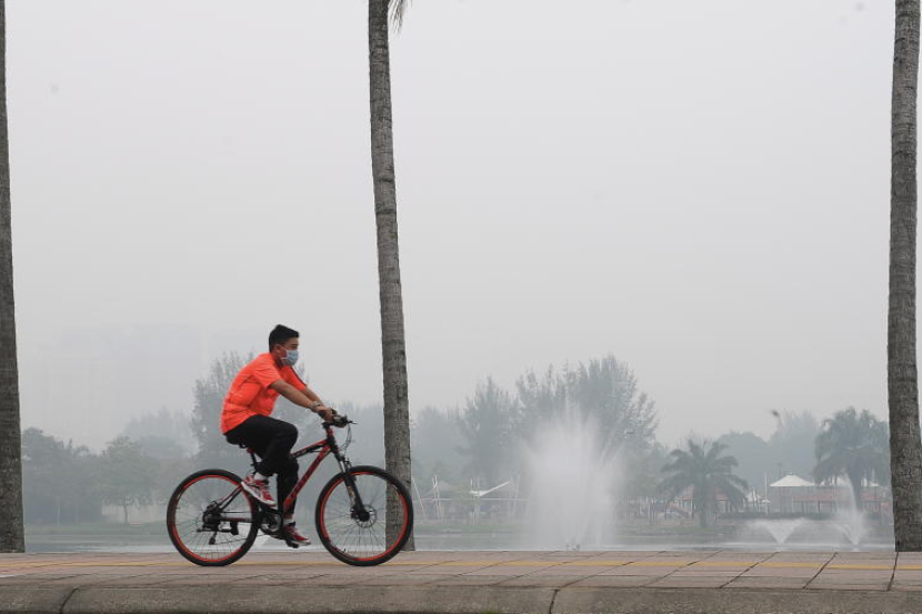 Seorang lelaki berbasikal dalam keadaan jerebu di Taman Tasik Titiwangsa, Kuala Lumpur pada Ahad. Foto Bernama