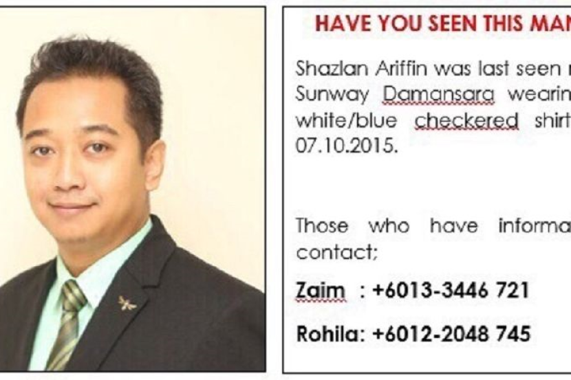 Abang iparnya yang enggan dikenali berkata Shazlan kali terakhir dilihat keluar dari kawasan rumahnya di Sunway Damansara pada Rabu lalu.